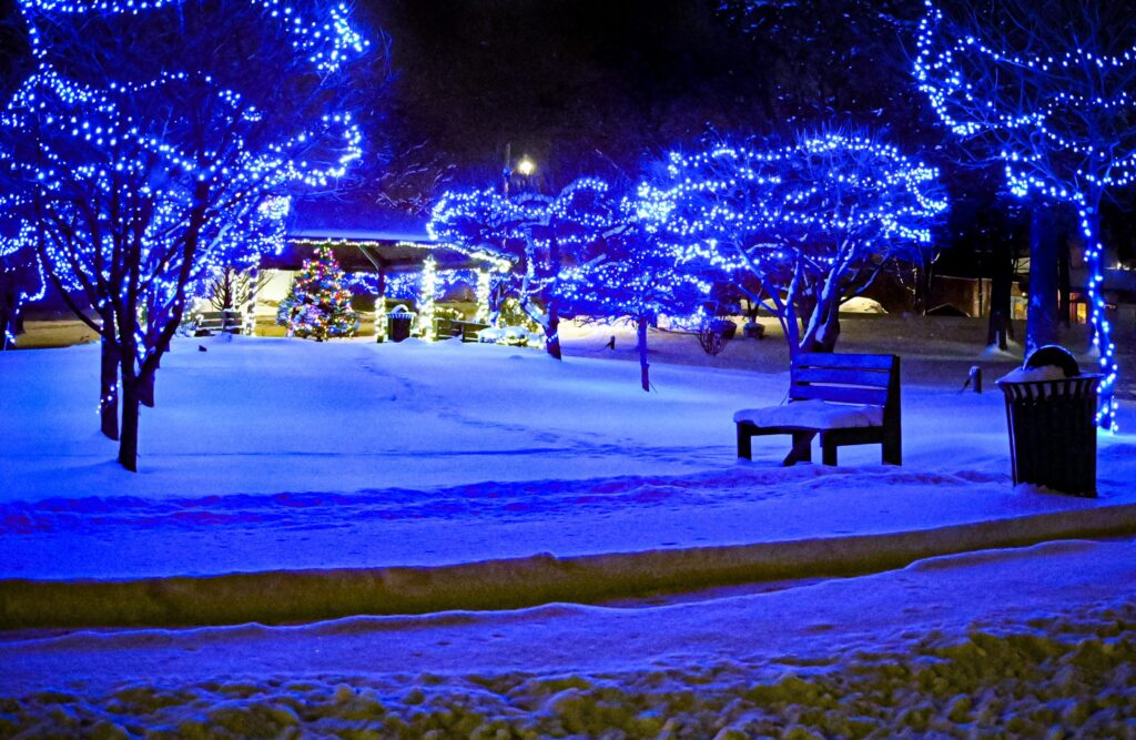 The park, now adorned with vibrant blues and shimmering lights, has quickly become a must-see destination for those seeking festive cheer. The scene features an intricate setup of lights strung across trees, casting a magical glow against the backdrop of freshly fallen snow.