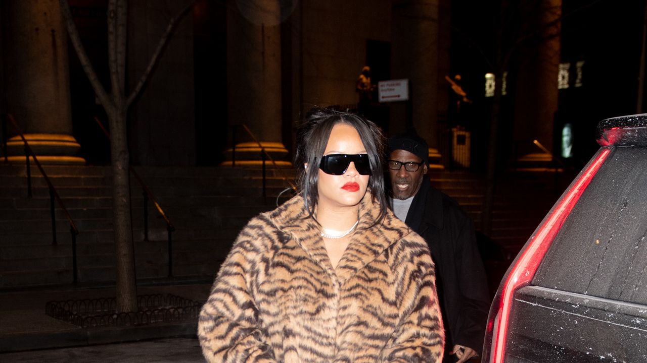 On March 15, 2024, Rihanna donned a luxurious tiger print, wool-blend jacquard coat designed by Alaïa, a brand she frequently favors. Complementing her statement coat, she wore matching tiger print calf hair pumps from the same French luxury house. The combination highlighted her ability to blend contemporary trends with nostalgic elements, making a powerful statement reminiscent of 1980s maximalist fashion.